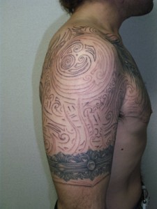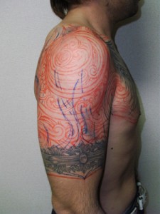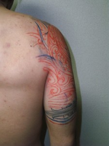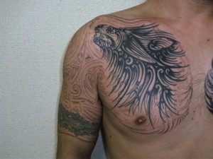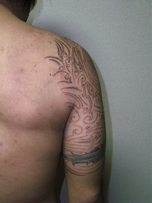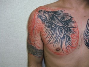 反対側の胸から腕にかけてのトライバルに合わせて、デザインしたトライバルをほんじつ、