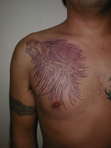 前回来て頂いた足のカバーアップのお客さまの胸に狼のトライバルのラインと色をざっと入れましたφ( ̄ー ̄ )