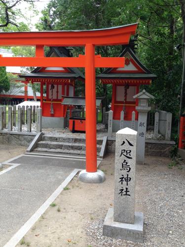 八咫烏は神武東征の折に高天原から遣わされ、熊野から大和まで神武天皇の道案内をした三本足の烏。