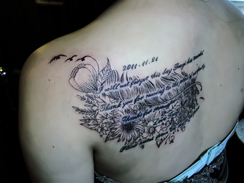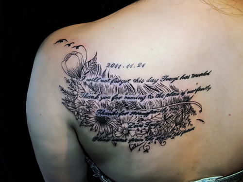 以前いれて下さった、家族へのメッセージに背景に、羽と花、植物をモチーフとしたデザインをラインとドットで入れましたヨψ(。。)(°°)